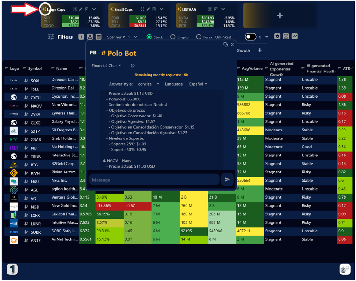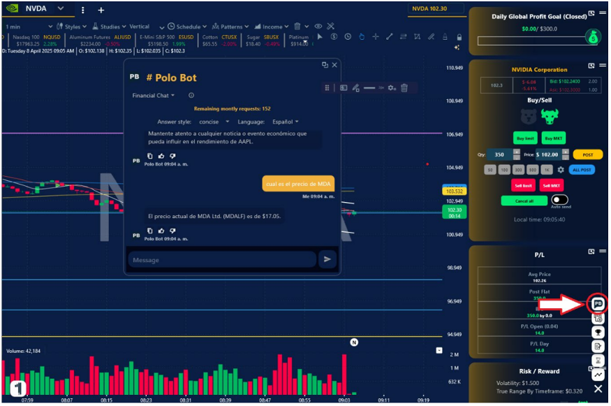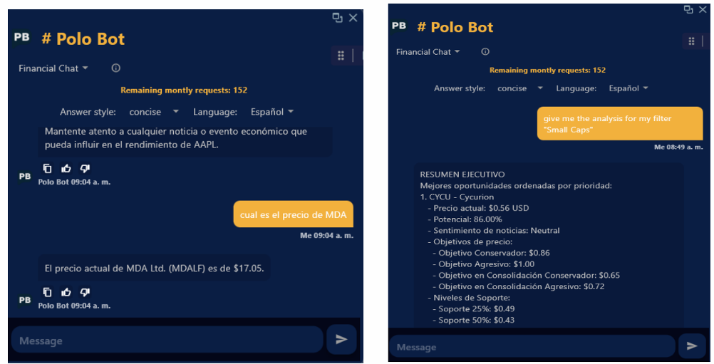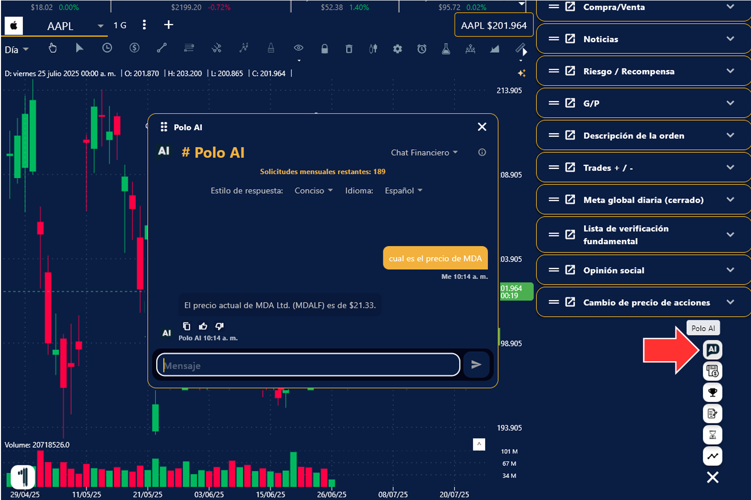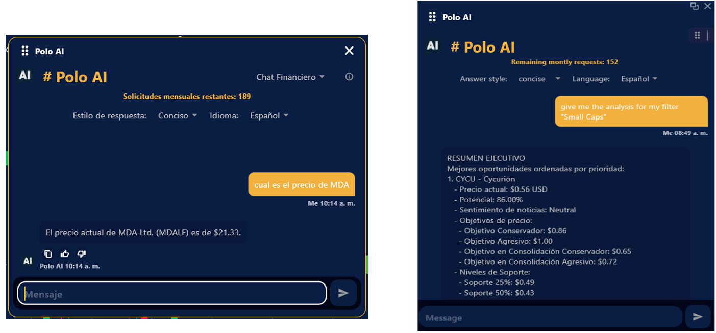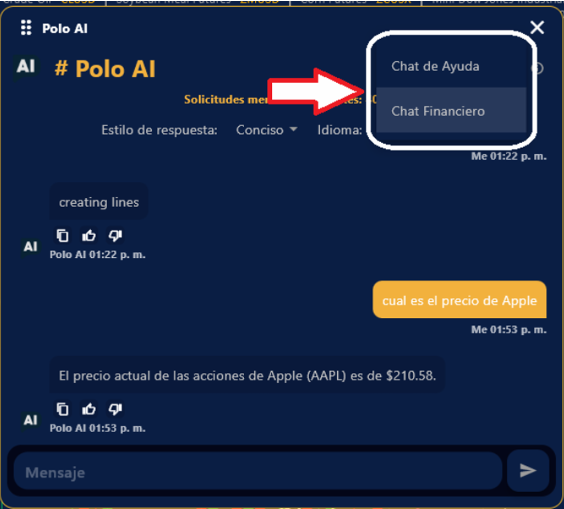 2. Polo AI está diseñado para contestar cualquier tipo de preguntas, básicas o avanzadas sobre trading. Desde cual es el precio de cierta compañía, hasta Análisis Complejos, Técnicos como Avanzados. Además de obtener al instante Líneas de Soporte, Consolidación y Targets.