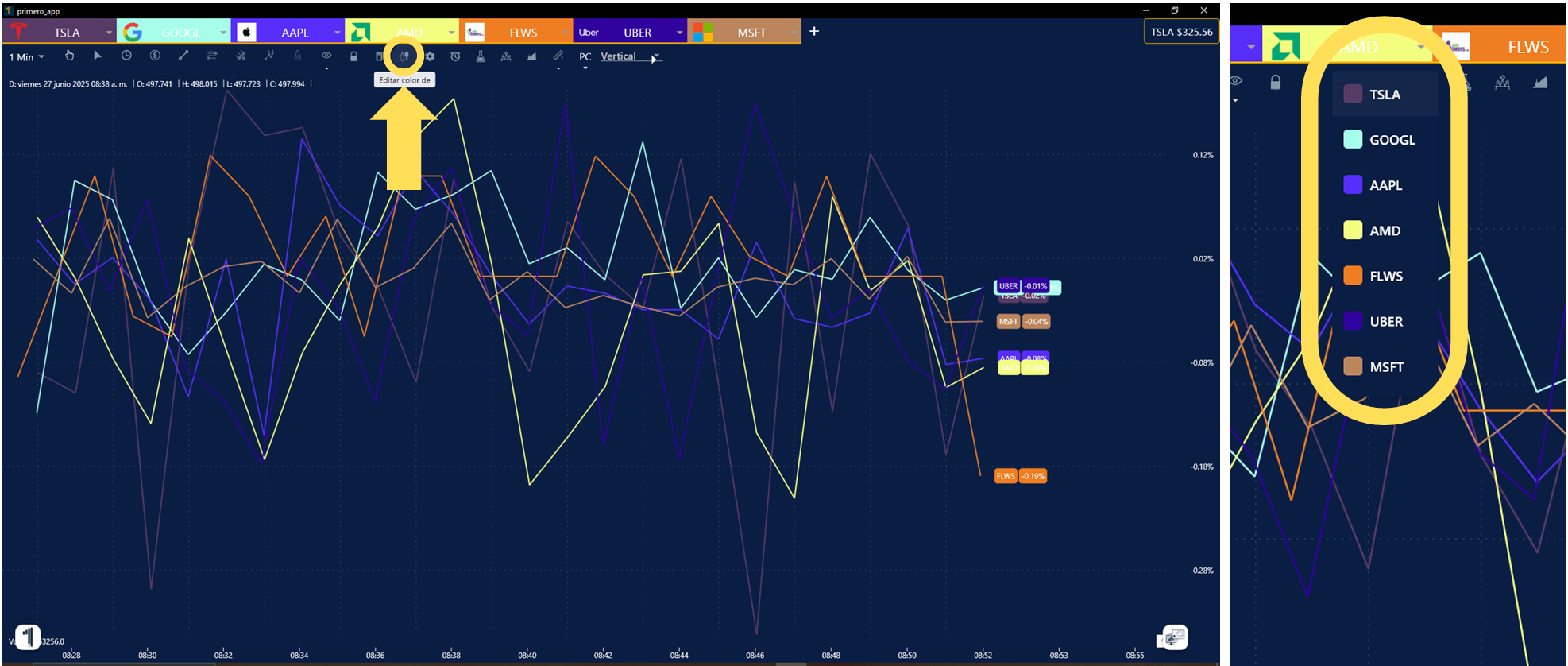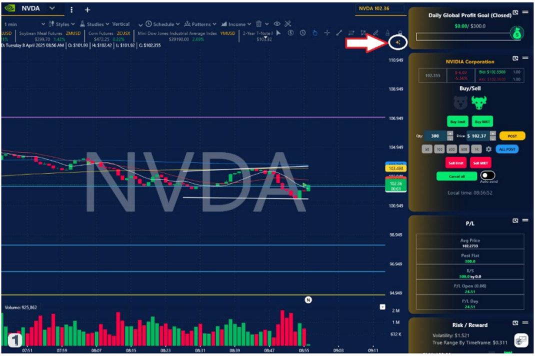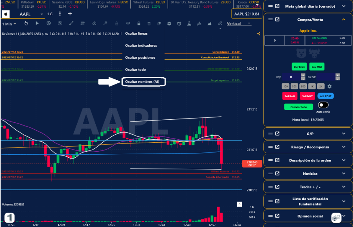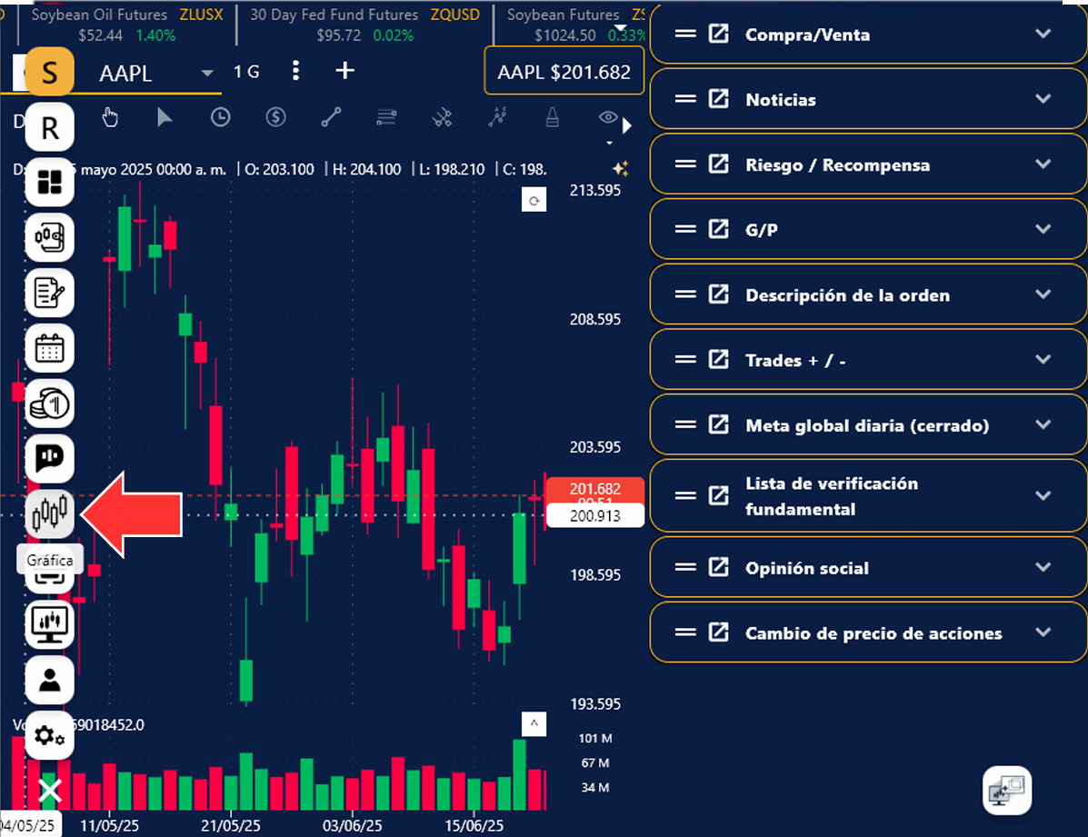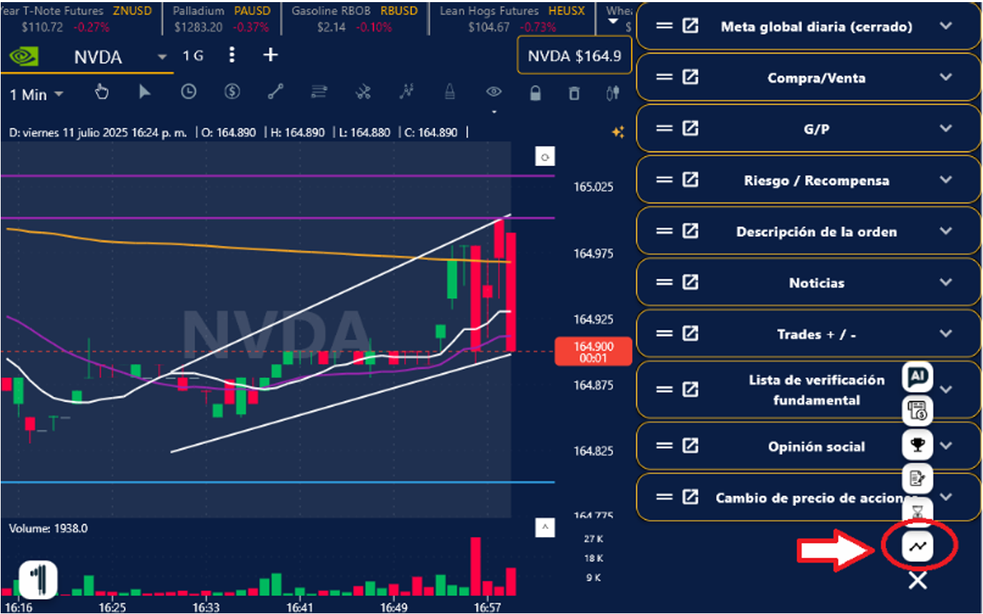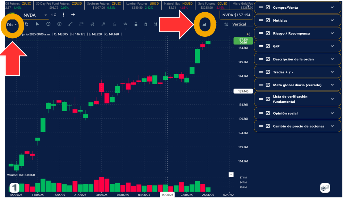 4. En la ventana de tu Grafica o Simulador, presiona el ícono de estrella del lado superior izquierda y listo, aparecerán las líneas automáticamente sobre la empresa seleccionada.