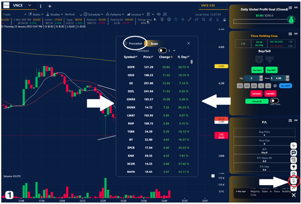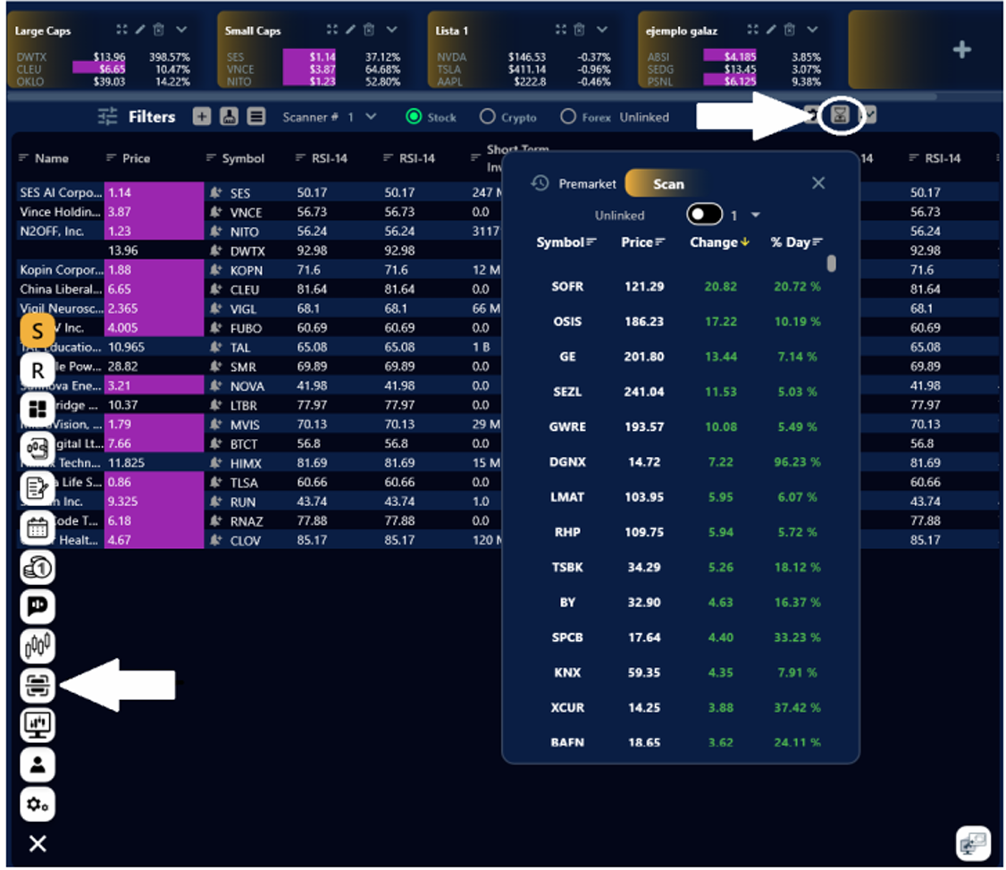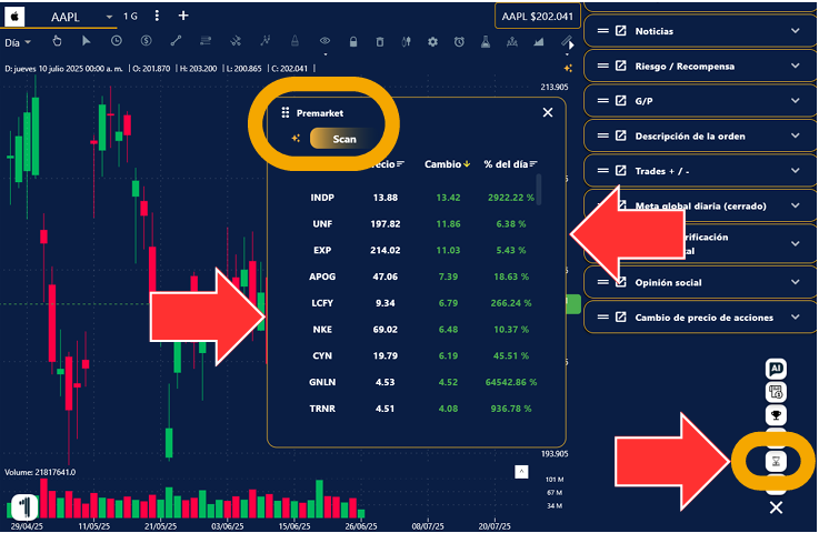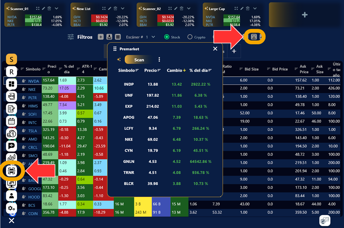 2. En el menú del lado inferior izquierdo se encuentra el icono del escáner, solo dale clic y saldrá la pantalla del escáner, ahí encontraras el icono del Pre-Market. Al seleccionarlo te saldrá el pre-market