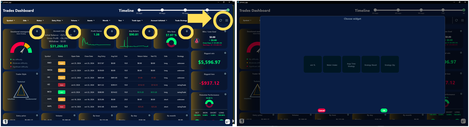 El tablero de operaciones o Dashboard de Primero Trader te permite llevar un registro detallado no solo de tus transacciones sino de todo tu progreso dentro del trading. El tablero de operaciones se personaliza de acuerdo con tus preferencias y obtienes: