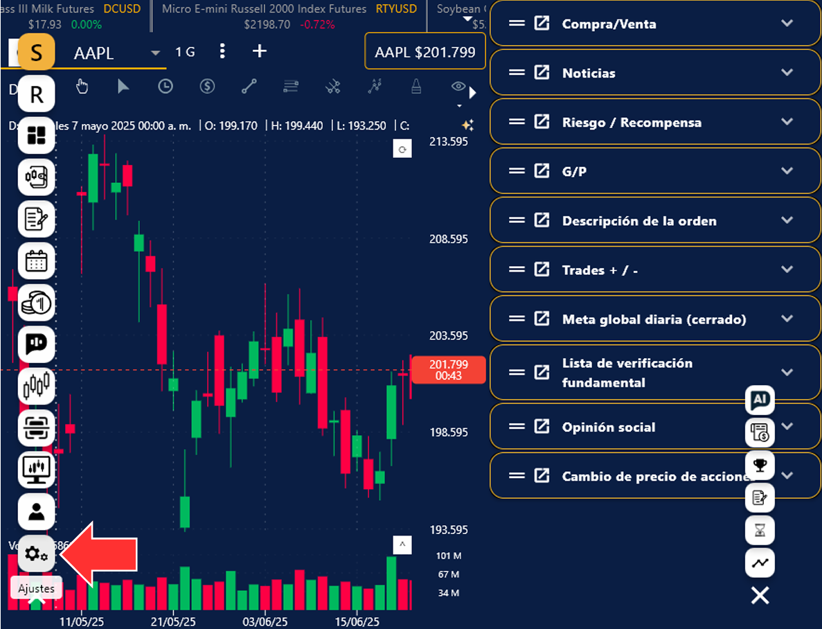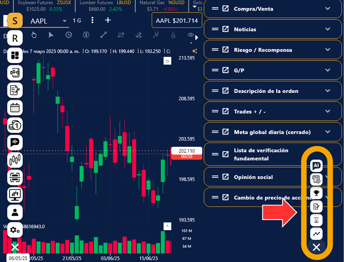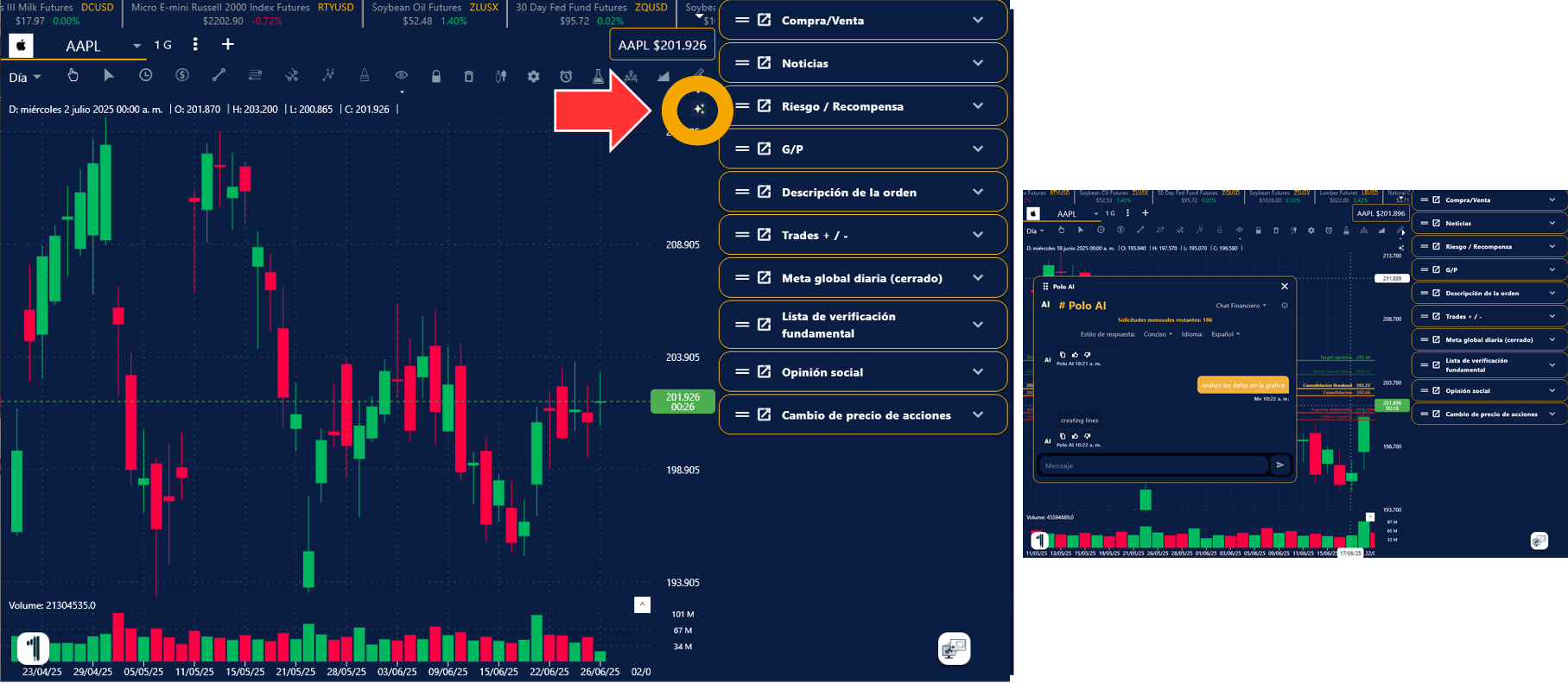 Búsqueda: Las ventallas flotantes del Escáner de volatilidad, El Premarket, Data Fundamental, Tabla de Liderazgo, Gestor de Cuenta y Polo AI, se encuentran en el menú de tu lado inferior derecho.