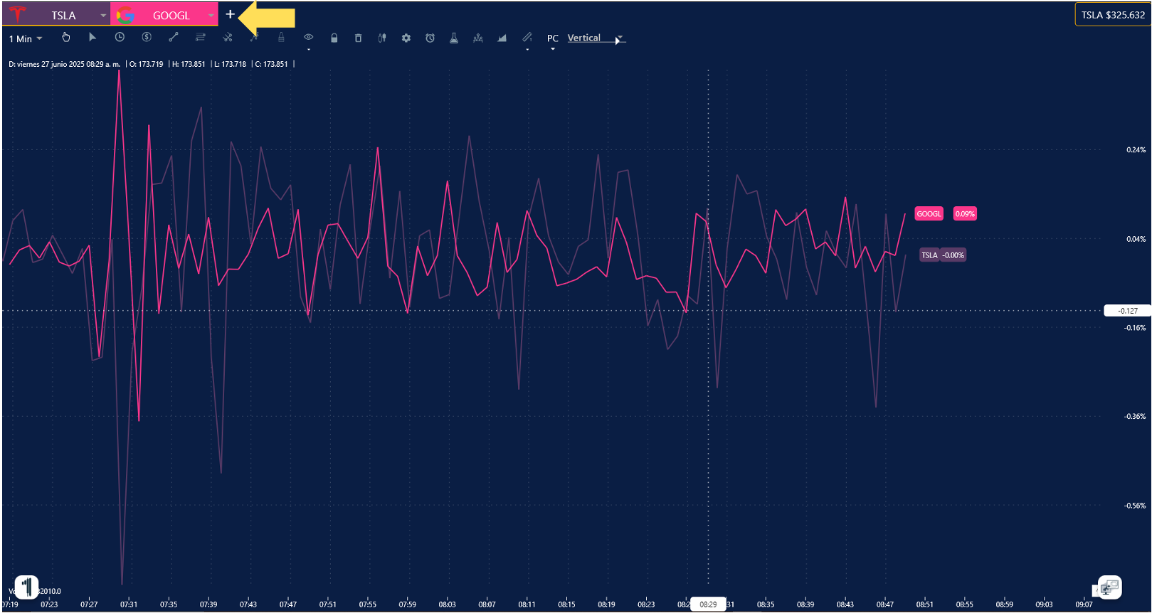 1. Abre tu gráfica y en el signo de + e ingresa el nombre de las empresas o mercados que deseas comparar