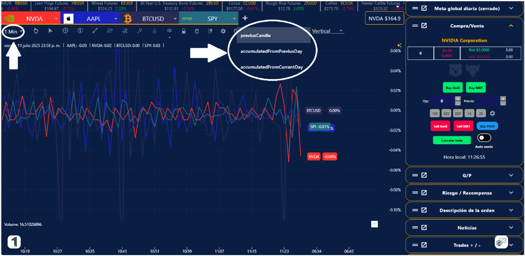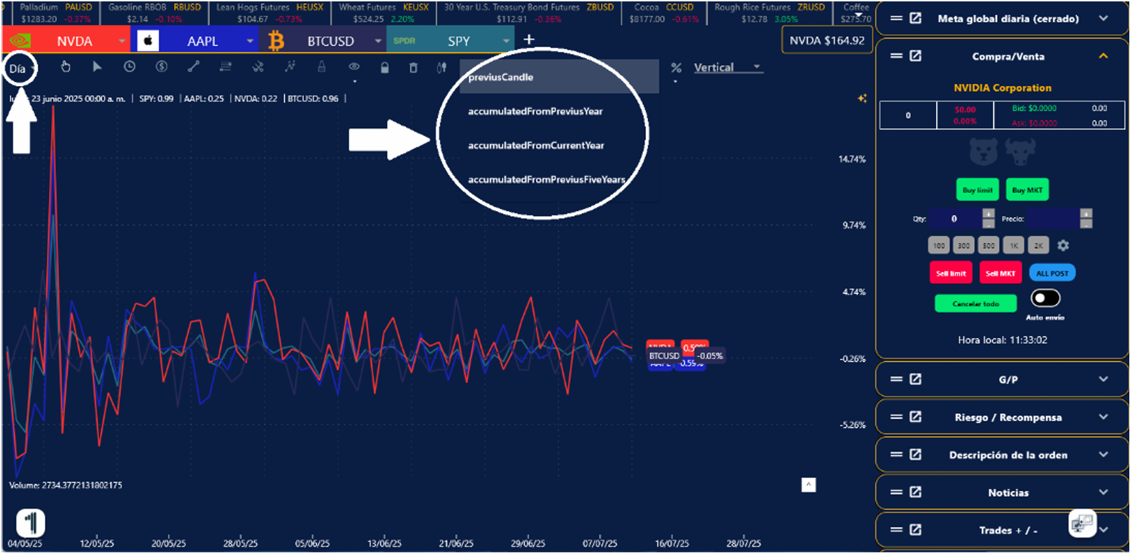 4. Puedes seleccionar el Tiempo de Comparación desde la vela anterior, día/año anterior o día/presente año.