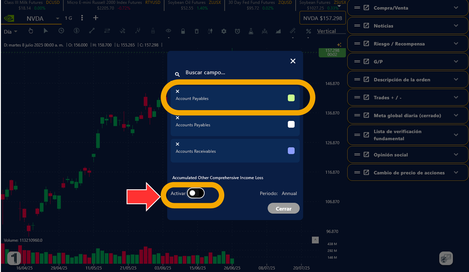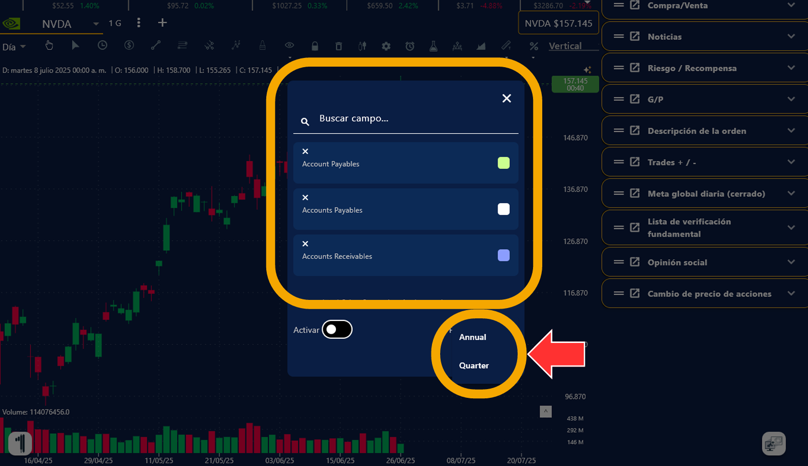 3. También aparecerá la lista de Data Fundamental de esa empresa, activa las casillas que quieres que se representen. Además de tener la libertad de escoger entre un Análisis Anual o Trimestral y personalizarlo como gustes.