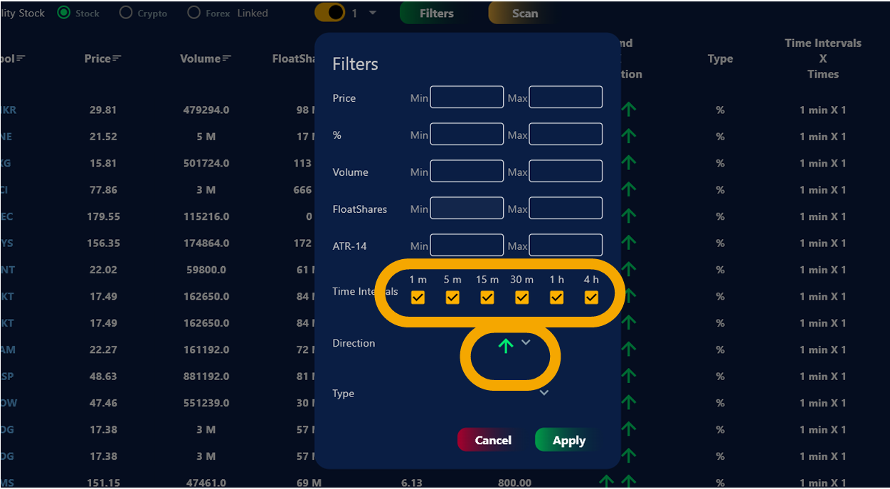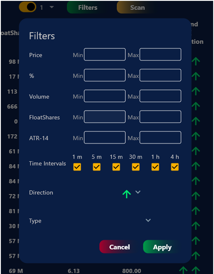 4. Aquí saldrán todos los espacios que necesitas llenar y que estén de acuerdo con tus Parámetros o Estrategias. Por ejemplo, que precio máximo o mínimo buscas, volumen, float shares, etc. Luego, haz clic en Aplicar y automáticamente te dará las empresas que se mueven a esa Volatilidad y llene dichos parámetros o requisitos.