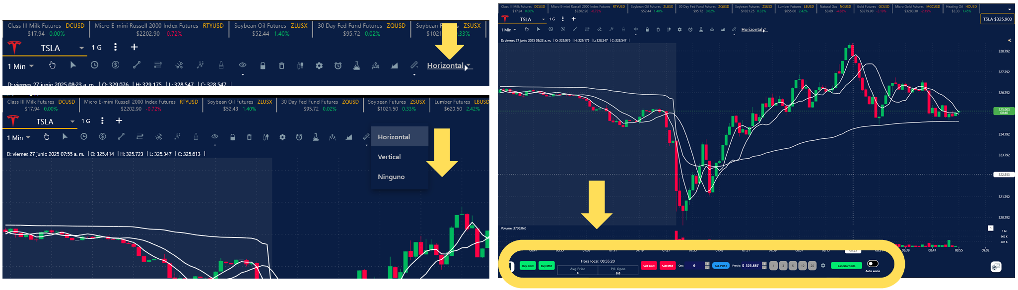 1. La pantalla del simulador puedes ajustarla para que los botones de compra y venta se puedan mostrar en la parte de abajo. Solo indica horizontal y se hará el ajuste automático