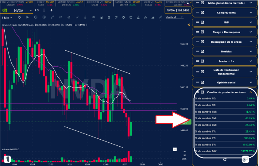 16. Esta sección te muestra el % de Cambio de Precio de las Acciones por Día, Mes y Año.