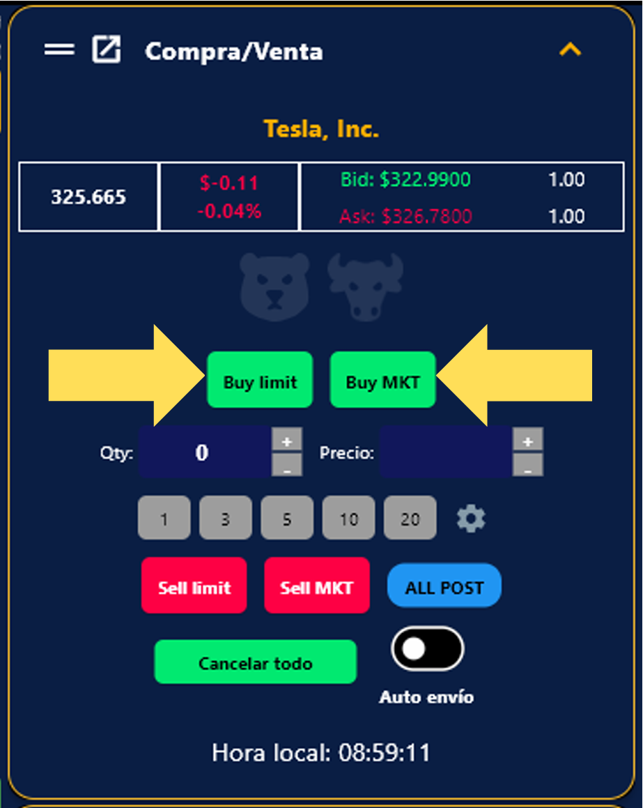 3. Para realizar compras, dirígete a la caja de ”Compra/Venta”. Selecciona la cantidad que te gustaría comprar y si deseas hacerlo con Buy Limit o Buy Mkt y simplemente dale clic al botón que elijas.