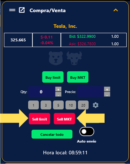 5. Para realizar ventas, selecciona la cantidad que te gustaría vender y si deseas hacerlo con Sell limit / Sell mkt, simplemente dale clic al botón que elijas.