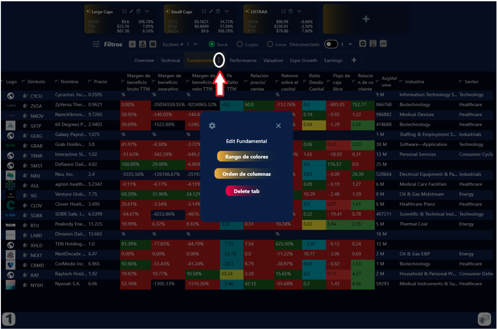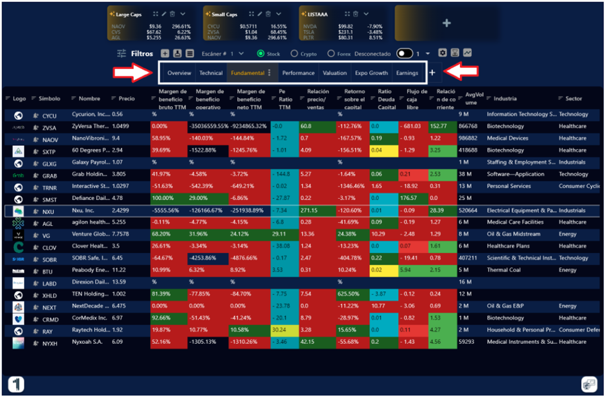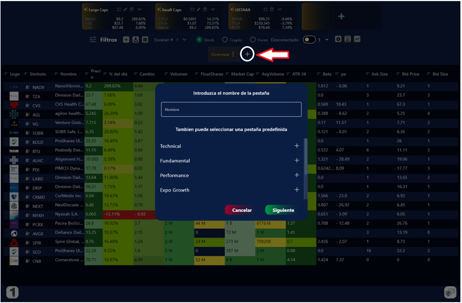 3. Para modificar el escáner de acuerdo con un análisis técnico, fundamental, crecimiento, ganancias, etc. Haz clic en el signo de + y te saldrán las diferentes pestañas predefinidas.