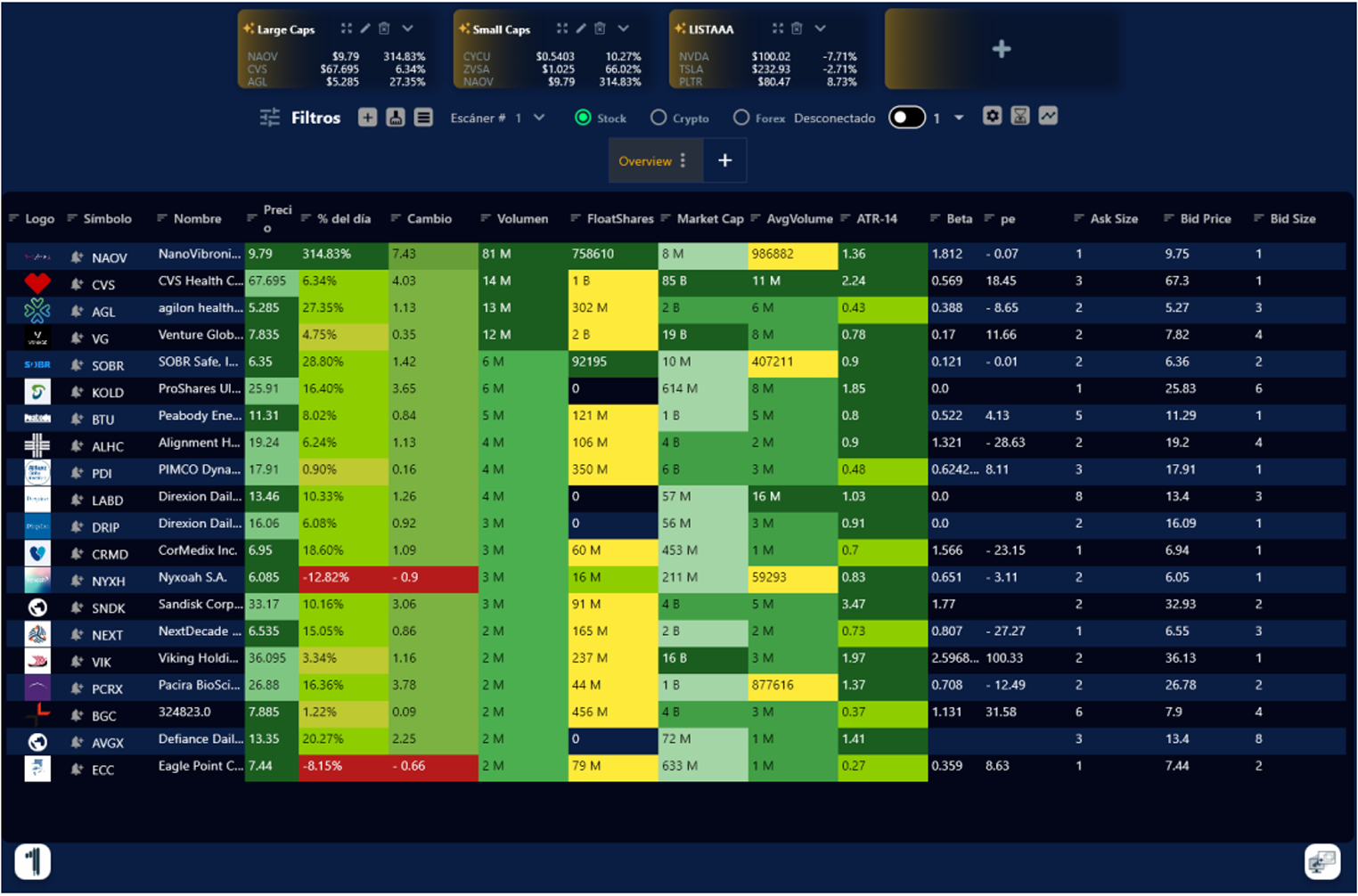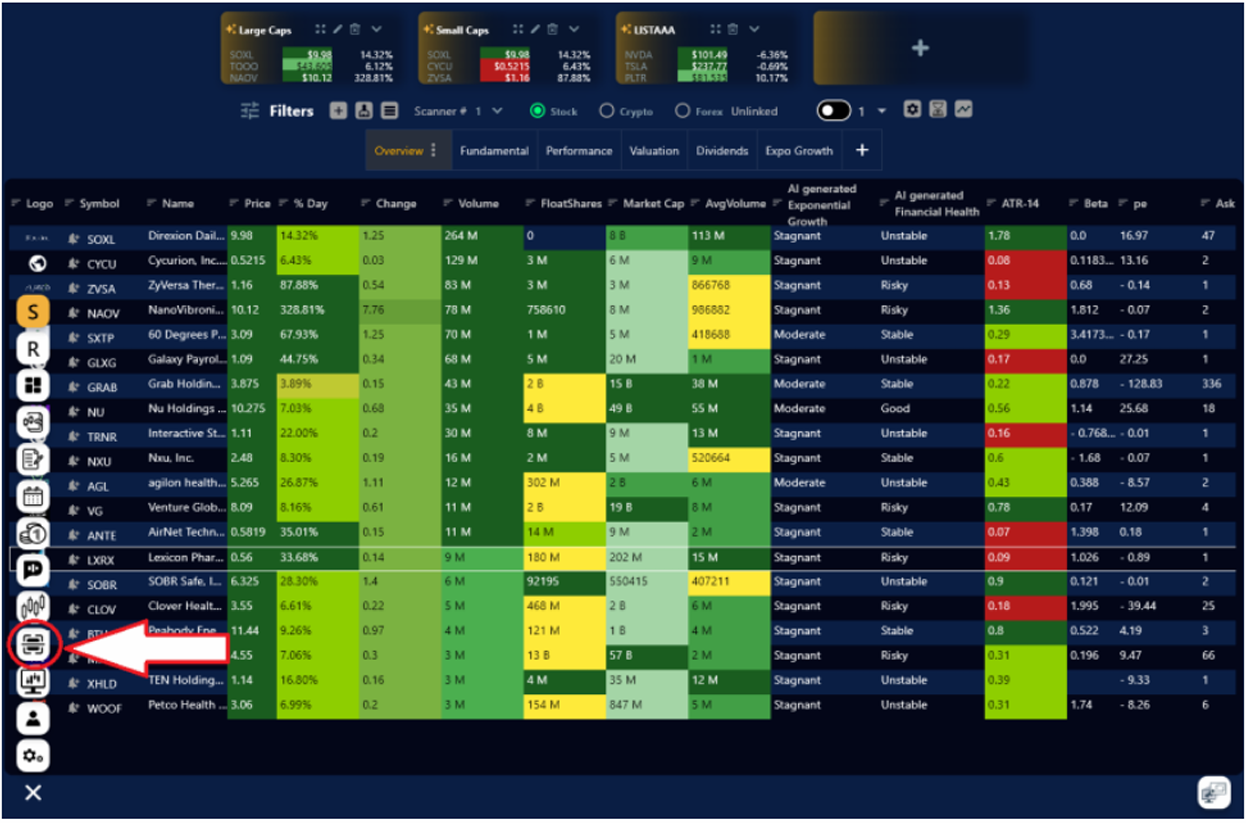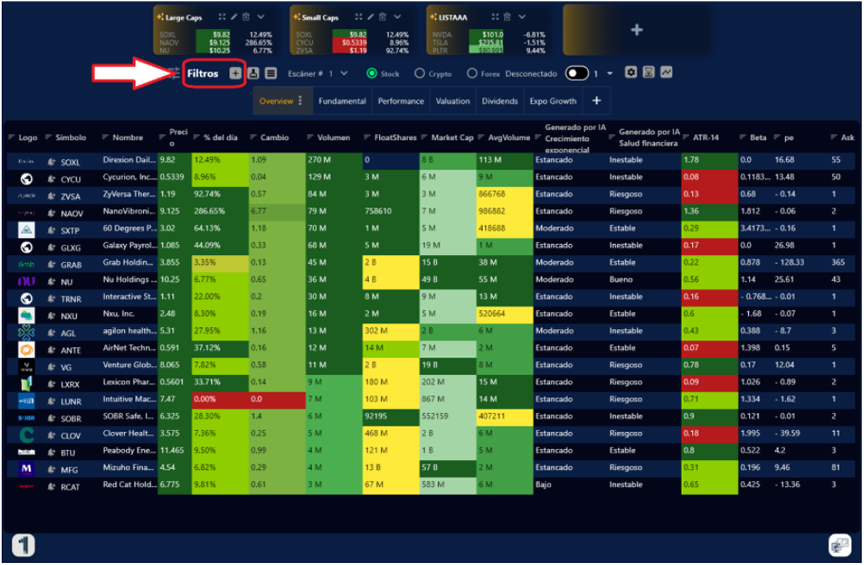 Con el Escáner de Primero Trader con Inteligencia Artificial Integrada podrás tener a la mano, la oportunidad de ver las mejores oportunidades que se presentan en el mercado día a día y personalizarlo de acuerdo con tus estrategias de trading. Contamos con el Escáner en Stock, Crypto y Forex.