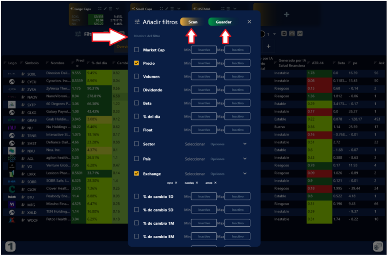 Búsqueda: El Escáner de Primero Trader ya viene configurado o tu puede personalizarlo a tu gusto