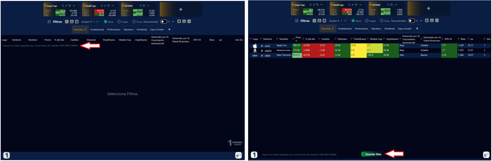 3. Si solo quieres información de empresas específicas, por ejemplo, Tesla, Apple, Uber, etc., simplemente, escribe sus tickers manualmente separándolos por una coma: TSLA, AAPL, UBER y se creara el filtro. No olvides guardar tu lista.