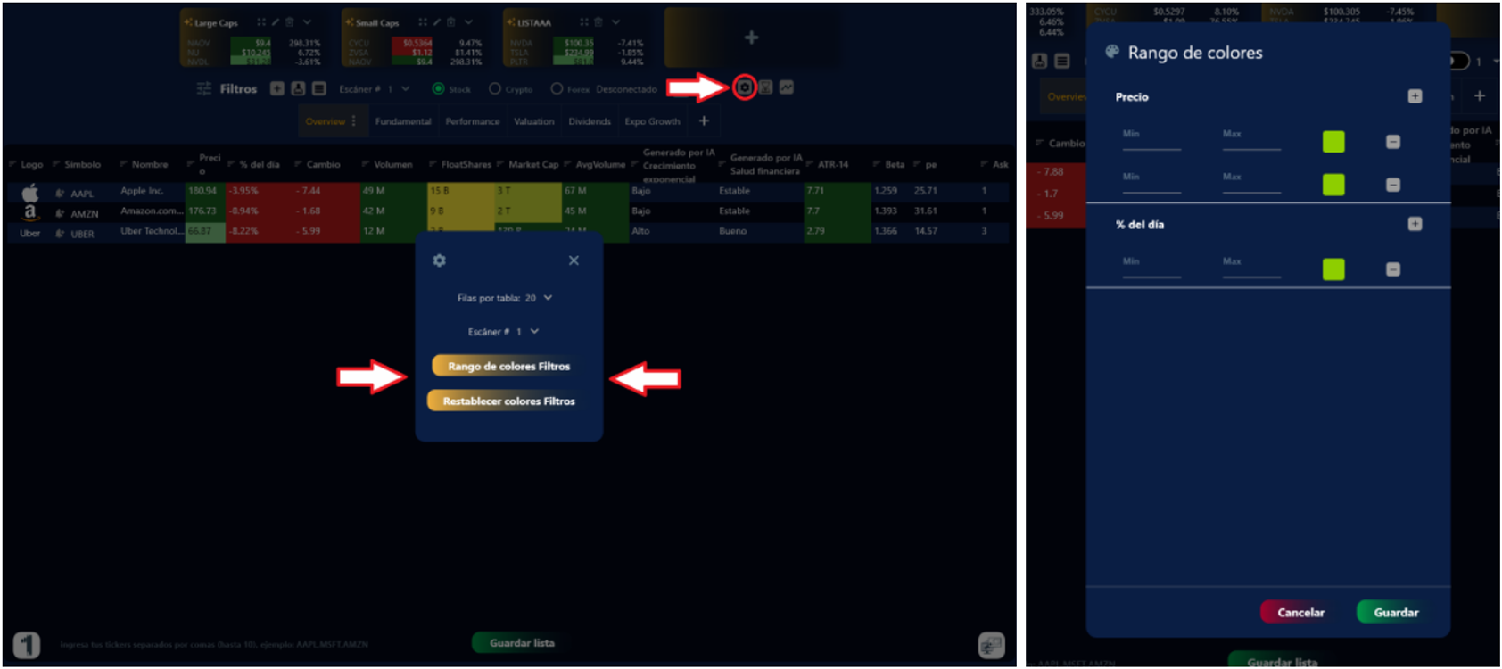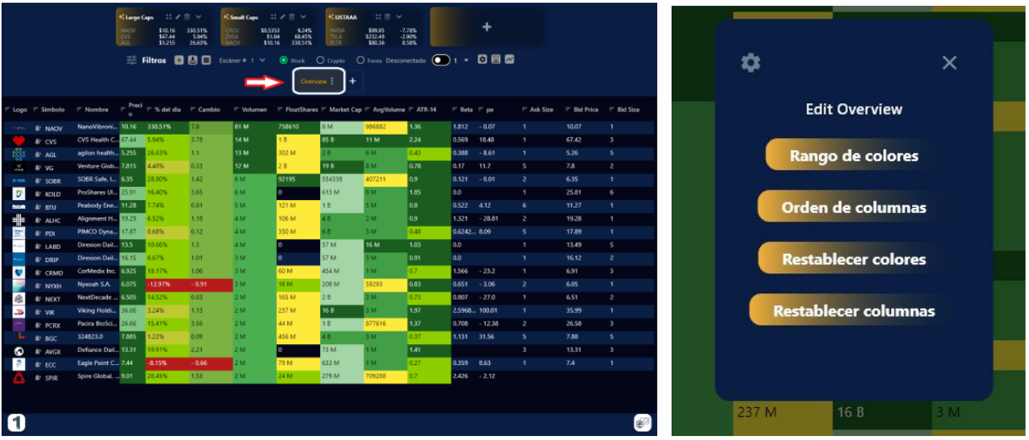 4. Para personalizar las columnas, haz clic en el botón de ajustes en la pantalla del escáner y saldrá la selección de Rango de colores y Restablecer los colores de los filtros . Ahí puedes hacer tu selección de acuerdo con los parámetros de tu estrategia.