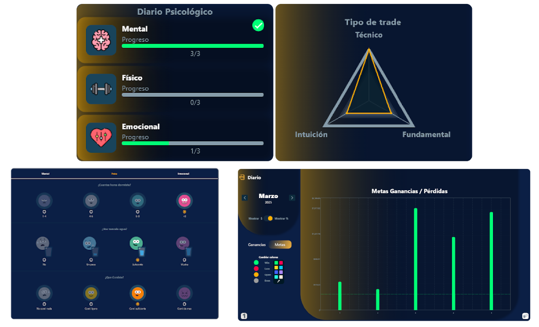 Dale seguimiento a tus trades y analiza día con día tus avances. Nuestro diario de trading te ayudará a identificar tus errores más comunes durante las operaciones y llevar un registro de tu estado físico, mental y emocional.